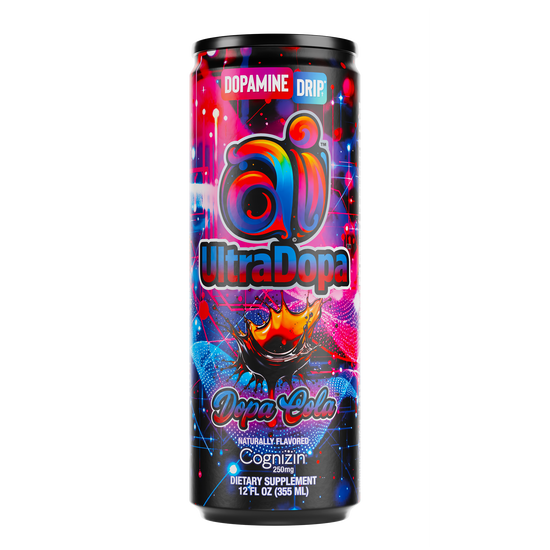 Ai UltraDopa Dopa Cola is a cola-flavored energy drink designed to deliver clean, focused energy without sugar or calories. It offers the familiar taste of cola but with an advanced NeuroSync™ nootropic blend built for motivation and mental clarity. With zero sugar, zero carbs and zero artificial colors, this cola-flavored energy drink fits into a sugar-free lifestyle while still giving you the refreshment of a classic soda profile.